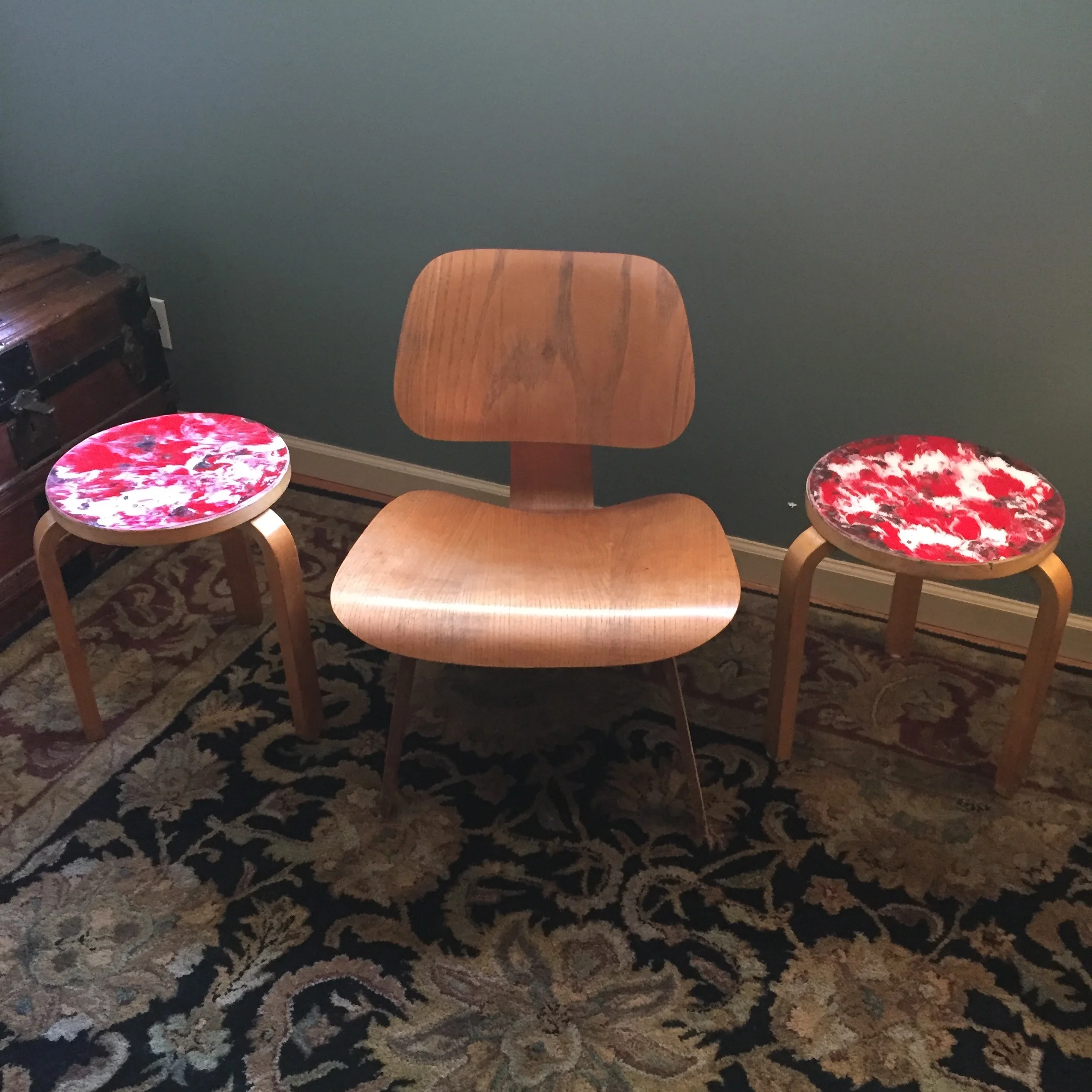 Painted vintage Alvar Aalto stools paired with original Eames LCW